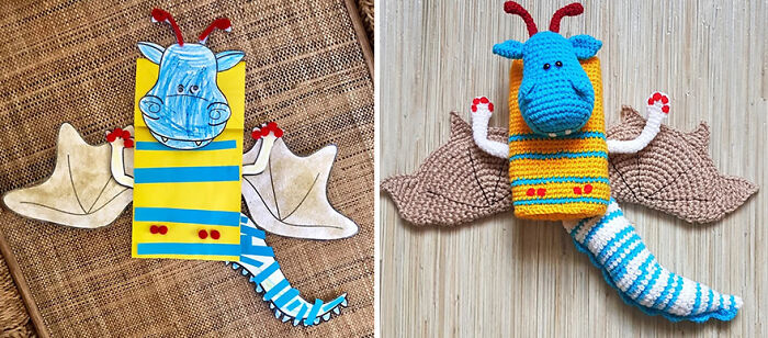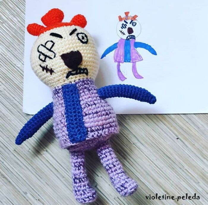 Violeta ha entrado más en detalles sobre su interés por hacer juguetes de ganchillo. "Comenzaré desde el principio. Mi interés comenzó en la infancia. Cuando era pequeña, hacía muchos juguetes para mí. Cuando tenía 9 años, mi madre me enseñó a tejer y hacer ganchillo. Luego comencé a tejer ropa para muñecas y mis juguetes hechos a mano. En la escuela, hice un examen de arte en grado 12 y el tema era juguetes cosidos. Durante ese examen, predije mi futuro porque no estudié costura, sino diseño de madera y tecnología. Pero los materiales y los hilos siempre me han interesado. recordándome los buenos pasatiempos y la relajación. Cuando tuve hijos, comenzaron a dibujar todo tipo de cosas. Después de ver uno de estos dibujos, no pude resistirme. La idea de que debía ser un juguete inmediatamente vino a mi cabeza."