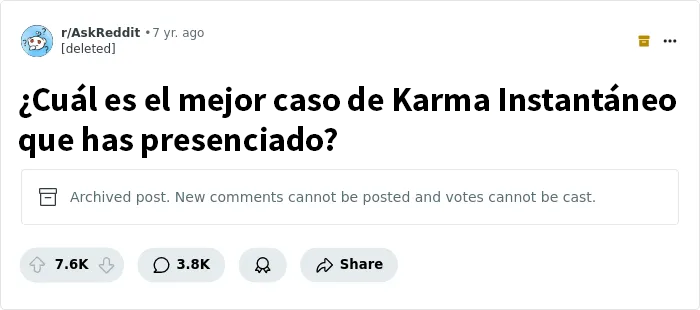 Alguien preguntó: "¿Cuál es el mejor caso de Karma Instantáneo que has presenciado?", y los internautas no se contuvieron. Compartieron los momentos que quedaron grabados en sus recuerdos de personas que recibieron lo que se merecían, justo cuando menos lo esperaban. Desde pequeñas molestias hasta comportamientos realmente malos, muchas de las historias sirven como recordatorio de que quien siembra vientos, recoge tempestades. ¡A veces más rápido de lo que se tarda en decir "se hizo justicia"!