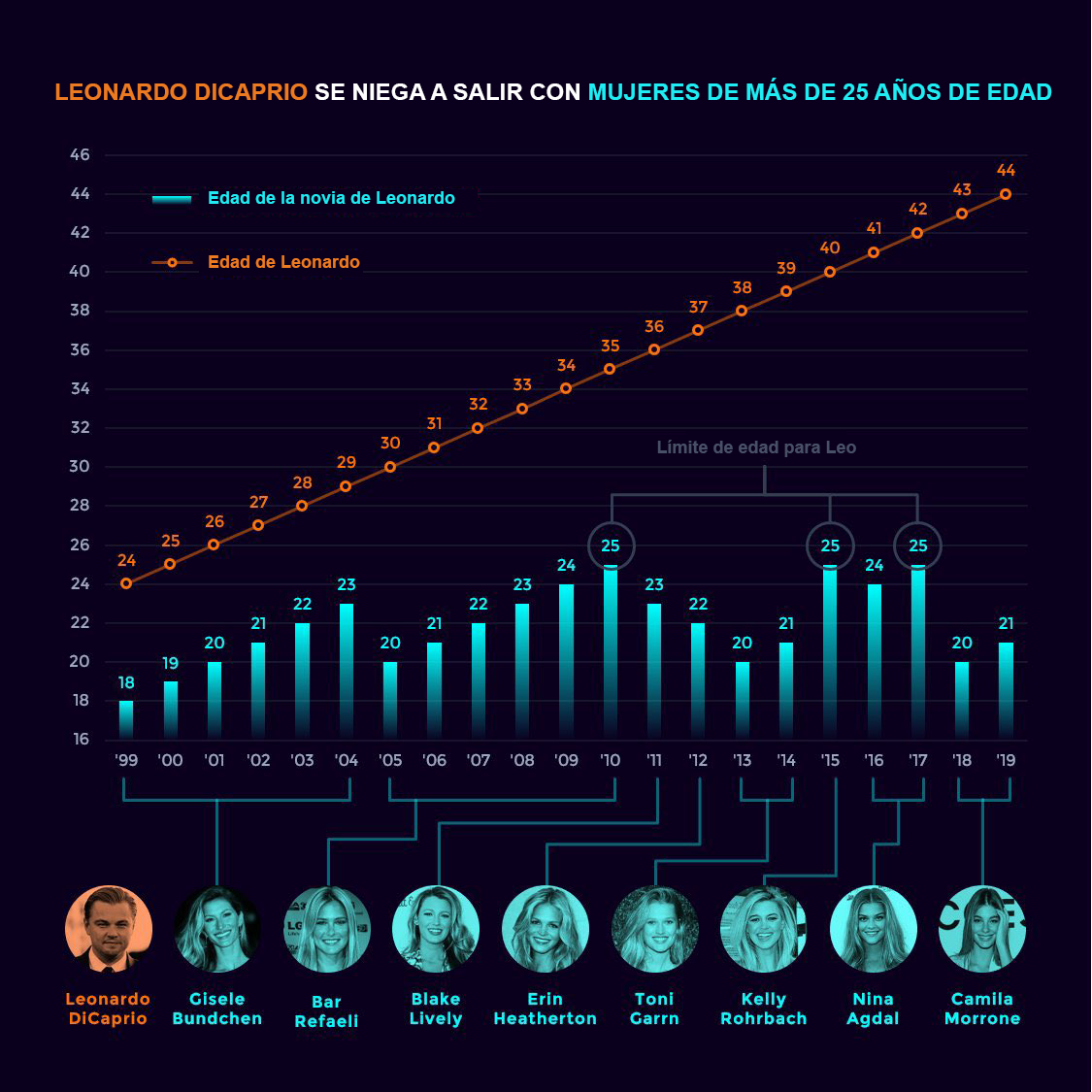 Estas relaciones no parecen tan sospechosas porque DiCaprio salía con mujeres que aún estaban en su franja etaria. Pero a partir de ahí la gente empezó a notar que, aunque el actor se hacía mayor, siempre salía con mujeres más jóvenes que él, siendo su edad límite los 25 años.