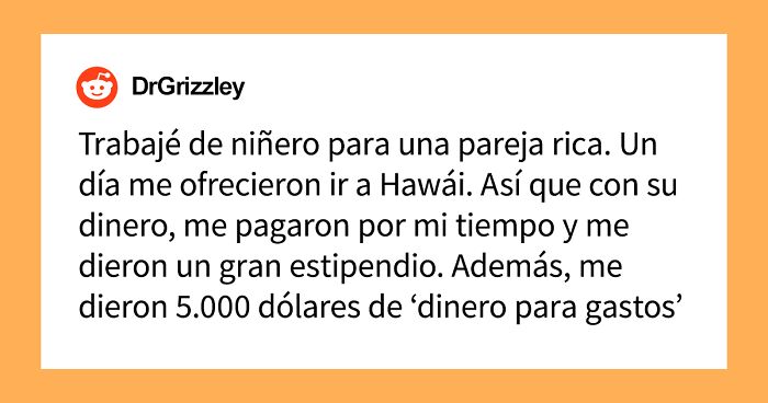 Trabajé de niñero para una pareja rica que quería que alguien cuidara de sus hijos. La esposa no quería una niñera y yo estaba en la universidad, así que me ayudaba a pagar las facturas. Un día me preguntaron: "¿Quieres ir a Hawái?". Resulta que la empresa de la que el marido era director de operaciones estaba haciendo un retiro ejecutivo en Hawái. En lugar de buscar una guardería en Hawái para sus hijos, pensaron que sería más fácil pagarme un vuelo a Hawái, cuidar de los niños durante el día y luego tener libres mis tardes o su "tiempo en familia".