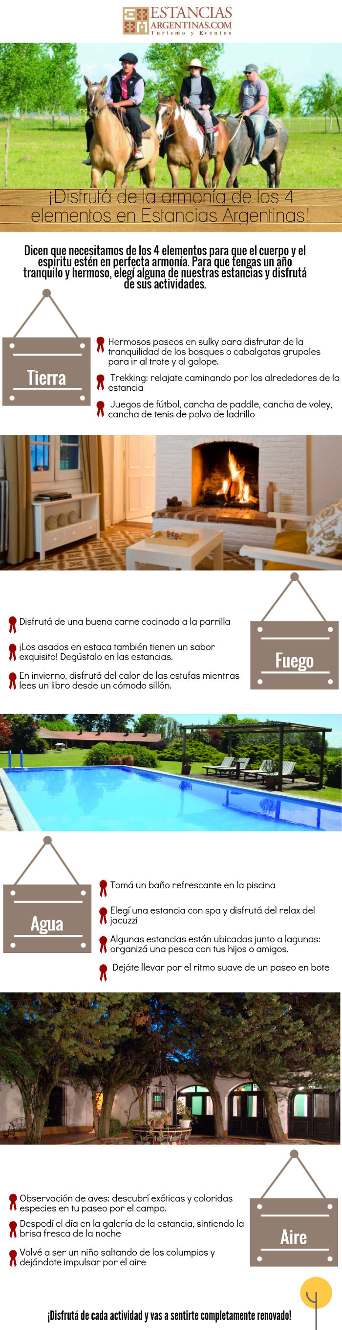 Hoy me gustaría compartirles una bonita infografía que encontré sobre las Estancias Argentinas. La misma hace referencia a cómo uno puede disfrutar de los 4 elementos: tierra, aire, agua y fuego, los que necesitamos para estar en armonía.