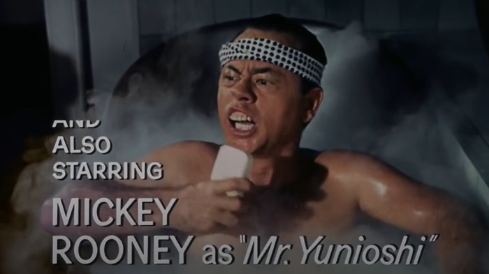 Mickey Rooney en Desayuno Con Diamantes: directamente interpreta a un asiático en la actuación más racista que jamás hayas visto.