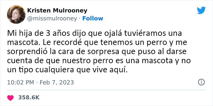 Kristen Mulrooney tuiteó recientemente la revelación de su hijo de 3 años de que su perro es en realidad una mascota, y muchos otros padres se animaron a compartir conversaciones similares que habían tenido con sus propios hijos. Así que a continuación encontrarás algunas de los relatos más divertidos en los que los niños confundieron adorablemente a sus mascotas con humanos, así como la entrevista con Kristen. Disfruta desplazándote por esta lista (en la que, seamos honestos, estos niños tienen algunas opiniones muy válidas), y asegúrate de votar todos los comentarios que calienten tu pequeño corazón amante de las mascotas.