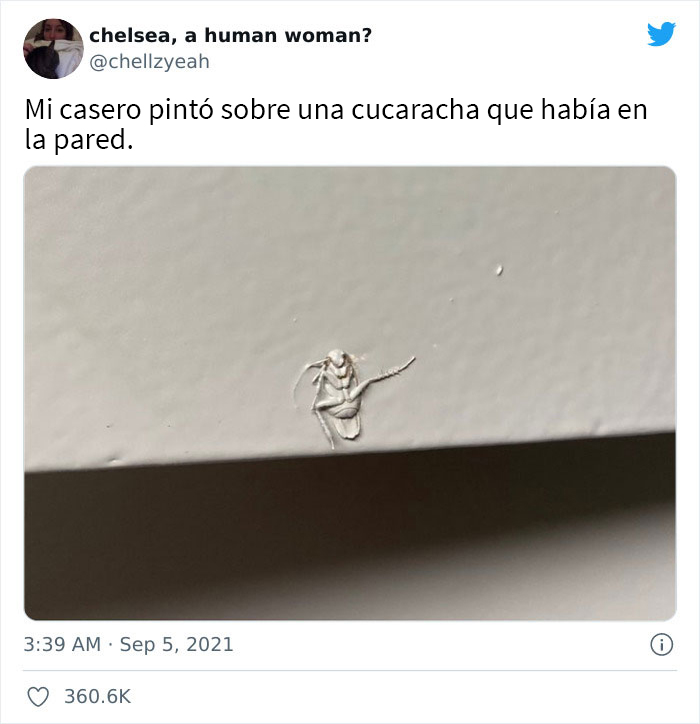 La usuaria @chellzyeah fue quien publicó este tuit y, para dar algo de contexto a la foto, agregó: “Mi casero pintó sobre una cucaracha que había en la pared”. Desde el 5 de septiembre, la publicación ha obtenido más de 360 mil “me gusta”.
