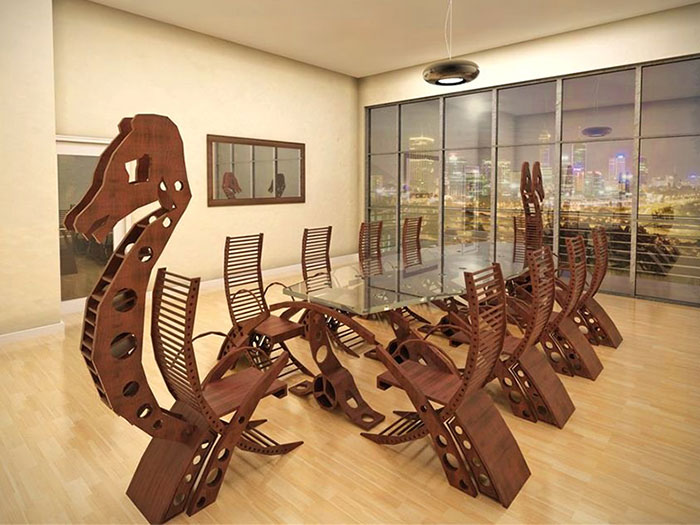 Si a primera vista te parece que esta representación conceptual puede ser un poco incómoda, probablemente tengas razón. Quinton J. Damstra, uno de los miembros de Wildetecture afirma rotundamente que «cree firme y absolutamente en la estética por encima de todo«. Así que esta muestra en 3 dimensiones de la mesa y las sillas vikingas puede no ser muy practica, ¡pero por supuesto que impresiona! Y ya que cruzar los mares nórdicos en un drakkar probablemente ni siquiera sea cómodo para empezar, quizá estas sillas tan curvadas puedan servir para añadir un toque de realismo.