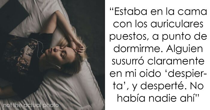 Cuando era adolescente, estaba acostada en la cama con los auriculares puestos, escuchando una de mis listas de reproducción mientras me quedaba dormida. Lo siguiente que recuerdo es que me desperté cuando alguien me susurró muy claramente "despierta" al oído, levanté la vista, miré a mi alrededor de mi habitación vacía y corrí escaleras abajo para contarles a mis padres sobre mi encuentro fantasmal. Pasé años contándole esto a la gente cuando surgían historias de fantasmas.