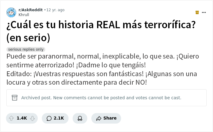 Pero hoy nos centraremos en historias reales que no son tan livianas. Estas historias espeluznantes y escalofriantes proceden de personas que han compartido en Internet sus experiencias con actividades paranormales y encuentros desagradables.