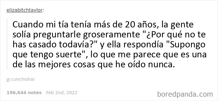 También ofreció una buena respuesta para cuando le preguntan a una mujer por qué no se ha casado todavía. "Supongo que la respuesta depende de la persona que pregunte, pero intenta suspirar y bromear: '¡Supongo que aún no he superado a tu padre!'".