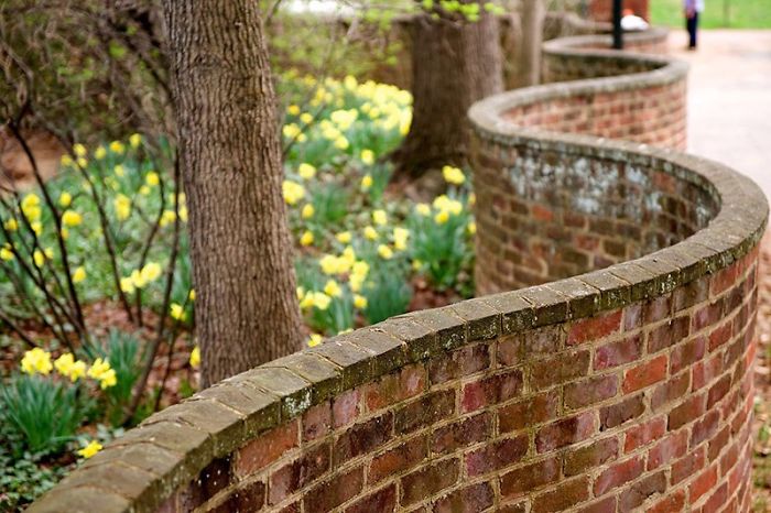 Populares en la isla británica, los muros ondulados fueron incluso exportados a Estados Unidos. Originalmente llamados muros de jardín «crinkle crankle», son muy económicos y necesitan menos ladrillos que los rectos. Quizá pienses que no tiene sentido, pero no es así: estos muros pueden tener solo una capa de ladrillos de grosor, mientras que los rectos se derrumban si los haces así. Las curvas del muro le proporcionan estabilidad.