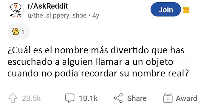 Mientras nuestra mente vaga desesperadamente en busca de la forma correcta de expresarse y llenar el vacío temporal, sólo queda una cosa por hacer: inventar un nuevo nombre. Lo ideal sería pensar inmediatamente en la palabra perfecta que capte la esencia de lo que vas a decir. Pero eso no suele ocurrir. Así que el Redditor the_slippery_shoe decidió aprender más sobre estas divertidas meteduras de pata y se dirigió a Ask Reddit con una pregunta: "¿Cuál es el nombre más divertido que has escuchado a alguien llamar a un objeto cuando no podía recordar su nombre real?"
