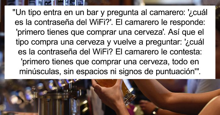 "Un tipo entra en un bar y pregunta al camarero: '¿cuál es la contraseña del WiFi?'. El camarero le responde: 'primero tienes que comprar una cerveza'. Así que el tipo compra una cerveza y vuelve a preguntar: '¿cuál es la contraseña del WiFi?' El camarero le contesta: 'primero tienes que comprar una cerveza, todo en minúsculas, sin espacios ni signos de puntuación'".