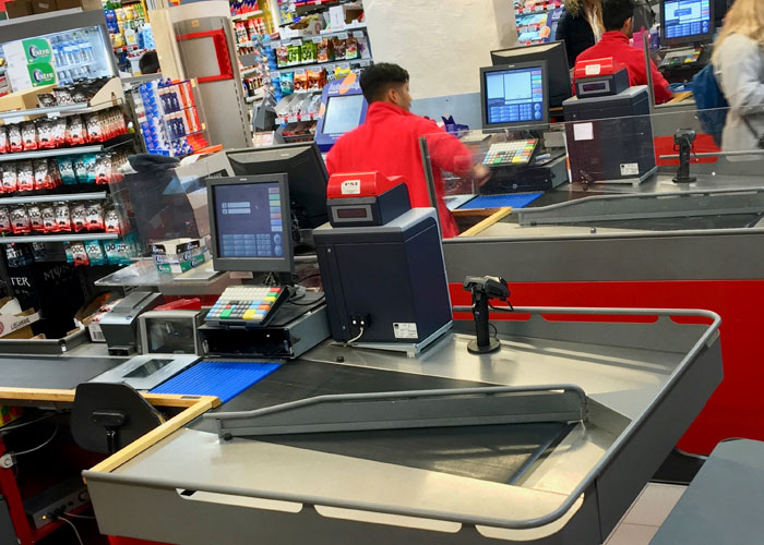 Por lo que he oído, permitir que los trabajadores de las tiendas se sienten. He oído que es normal que la gente se siente en Europa como cajeros, pero en los EE.UU. es visto como perezoso. La única tienda que conozco que lo permite es Aldi y eso es porque ayuda a sus métricas de caja.