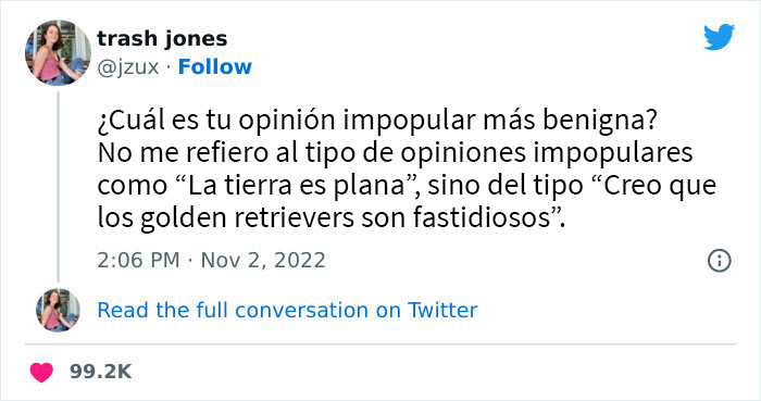 Una popular usuaria de Twitter llamada @jzux —alias ‘Trash Jones’— les pidió a sus seguidores que compartieran sus opiniones impopulares más benignas. Como era de esperar, el hilo fue demasiado difícil de resistir para muchos de los usuarios de la aplicación del pájaro y el tuit se hizo viral, recibió más de 21.400 citas, así como muchas respuestas divertidas bajo la publicación original.
