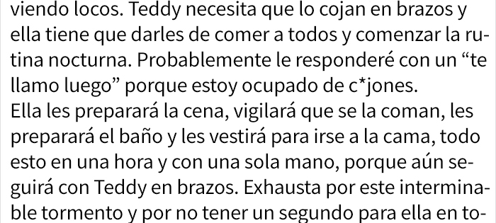 Hay mucha gente convencida de que ser padre o madre ama de casa no es tan duro, y los padres exhaustos a menudo tienen que mostrarles la realidad. Una de las formas en que derriban el mito es compartiendo sus dificultades como padres. Brad Kearns es padre de 3 hijos, y junto a su esposa documenta el ser padres en las redes sociales. Decidió explicar lo que es ser padre a tiempo completo. Brad y su esposa Sarah llevan casados 10 años y se conocieron en la adolescencia. Brad trabaja en el mundo de los negocios, pero ha expresado que su trabajo no es nada comparado con la rutina diaria de su esposa, que se queda en casa con los niños. Las cosas que hace Sarah para cuidar de los niños, como llevarlos al parque («qué fácil es,» escribe Brad) parecen poco importantes para la mayoría. Pero explica lo agotadoras que son estas tareas aparentemente pequeñas. «Las comparaciones te roban la alegría. Sobre todo si comparas quedarse en casa con los niños versus ir a trabajar. Cualquiera que trabaje con niños tiene una tarea dura por delante, le paguen por ello o no,» dijo Brad. Esta publicación que escribió al respecto se volvió viral, y muchas madres le agradecen el reconocimiento ante esta verdad a menudo pasada por alto. ¡Aquí debajo puedes leerlo!