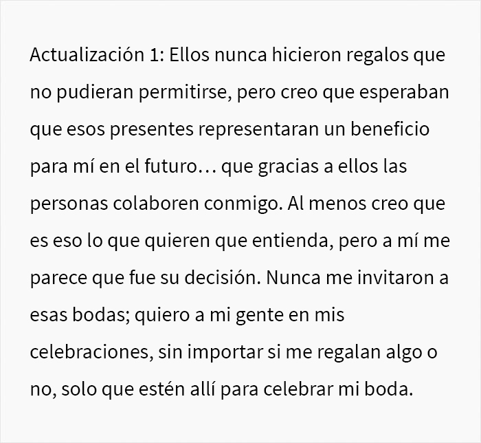 Una usuaria de Reddit contó cómo sus padres planeaban utilizar su boda como una oportunidad para conseguir dinero. Su idea era obligar a su hija a invitar a todos sus parientes lejanos y conocidos , y que llevaran dinero como regalo. Esa era, según los padres, la forma de recuperar todo el dinero que, a lo largo del tiempo, invirtieron en las bodas, fiestas de graduación, y otros eventos importantes de esas personas. Desde luego que la usuaria de Reddit los confrontó cuando se dio cuenta que no tenía ningún control sobre su propia boda.