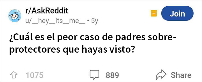 Un usuario de Reddit con el apodo ‘__hey__its__me__’ ha pedido recientemente a sus compañeros internautas que compartan los peores casos de padres sobreprotectores que hayan visto; y desde luego que lo hicieron. Las historias eran de todo tipo, desde padres escuchando conversaciones telefónicas de sus hijos hasta atarles los zapatos durante una década más de lo que probablemente deberían haberlo hecho, y mucho más. Si estás interesado en más ejemplos de este tipo de crianza, no te pierdas la lista a continuación para ver cuán involucrados están algunas mamás y papás en la vida de sus hijos.