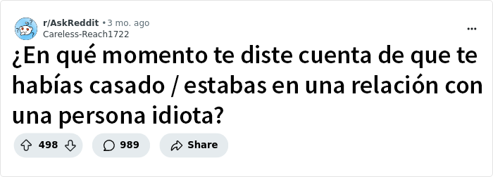 Todos tenemos nuestros momentos, y algunos son menos afortunados que otros. Sin embargo, el usuario de Reddit Careless-Reach1722 quiso cortar por lo sano y pidió a todos los usuarios de la plataforma que describieran el momento en que se dieron cuenta de que su pareja era un auténtico imbécil.