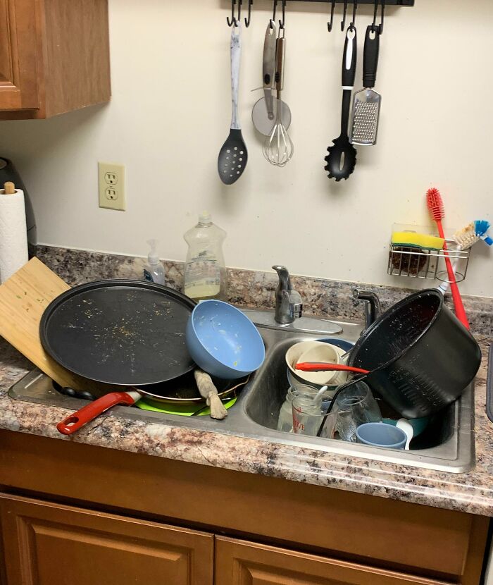 Mi compañero de piso tira los trastes a la basura para no tener que lidiar con ellos (yo compré todos los trastes y cubiertos)