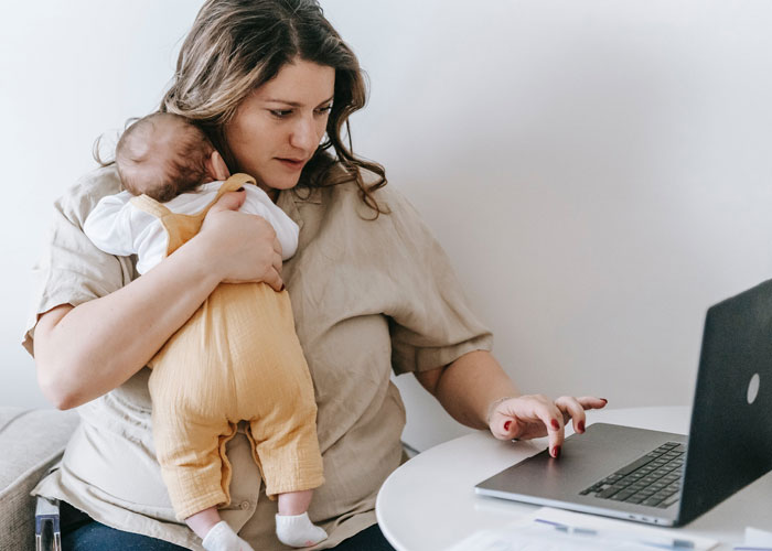 No tengo permiso de maternidad y los de recursos humanos me dijeron que esa es la ventaja de trabajar a distancia: puedo cuidar a mi bebé mientras trabajo.