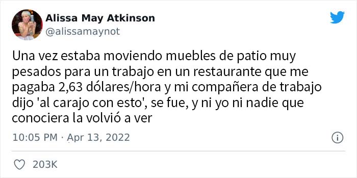 Siguiendo la tendencia, la usuaria de Twitter Alissa May Atkinson, de Brooklyn, Nueva York, compartió una historia de cómo "Una vez estaba moviendo muebles de patio muy pesados para un trabajo en un restaurante que me pagaba 2,63 dólares/hora y mi compañera de trabajo dijo 'al carajo con esto', se fue, y ni yo ni nadie que conociera la volvió a ver". El tuit acumuló 203 mil likes, resonando con mucha gente en la plataforma.