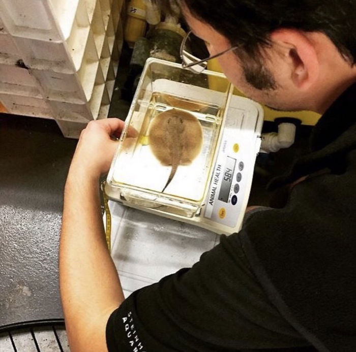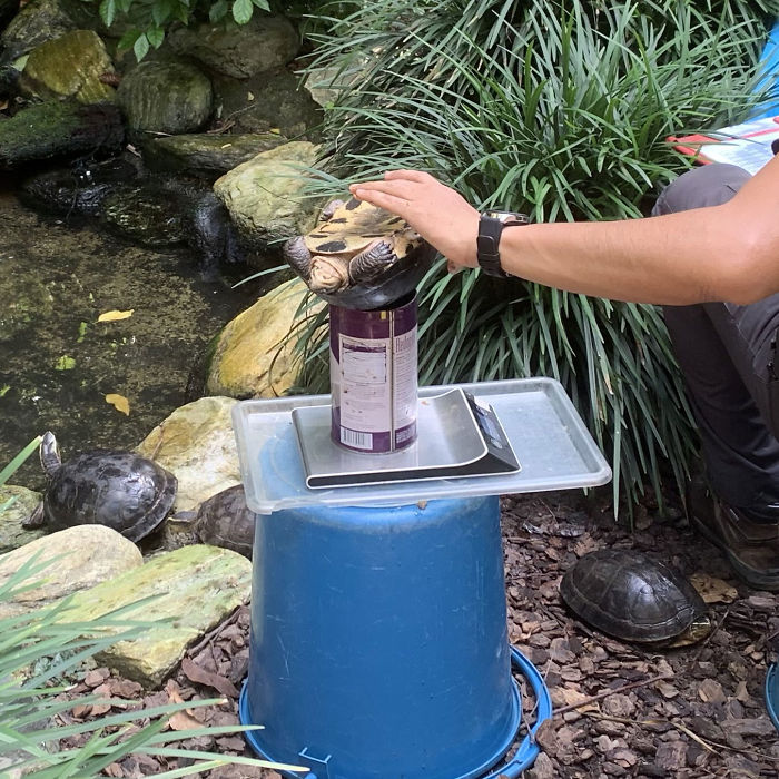 "Nuestra tortuga marina, Myrtle, pesa unos 250 kilos, y le hacemos un chequeo completo 2 veces al año, lo que incluye pesarla, análisis de sangre y ultrasonidos. Y las anacondas reciben este chequeo una vez al año." Sin embargo, las crías necesitan ser chequeadas y pesadas más a menudo.