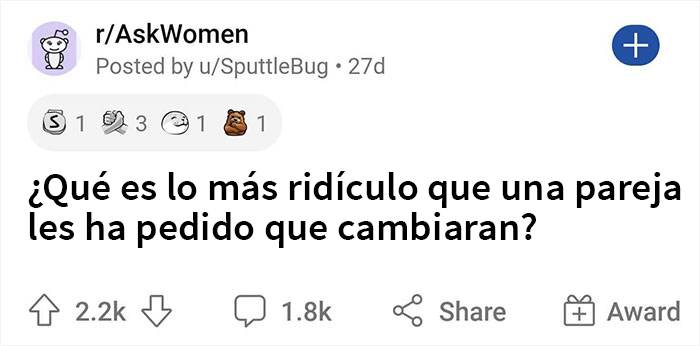 Así que, cuando el usuario de Reddit SputtleBug publicó la siguiente pregunta: “¿Qué es lo más ridículo que una pareja les ha pedido que cambiaran?” en r/AskWomen, parece ser que tocó una fibra sensible para muchas mujeres en la comunidad. Entonces compartieron sus experiencias genuinamente perturbadoras, que mostraron lo letales y equivocadas que pueden ser algunas relaciones, y nos recordó a todos que no tenemos por qué tolerar estas situaciones.