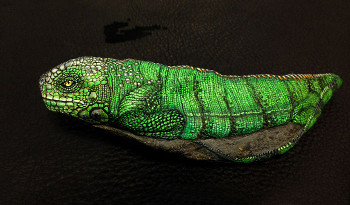 Para sacar a la superficie al ser vivo que siento en la piedra, procedo con mucho cuidado. Voy paso a paso,considerando si, por ejemplo, estoy poniendo la espina dorsal en el lugar adecuado. Pinto los ojos al final, y solo considero mi trabajo terminado cuando veo la vida en esos ojos y me devuelven la mirada. Para mi, completar una obra no trata sobre cuántos detalles he pintado, sino en sentir la vida en la piedra.
