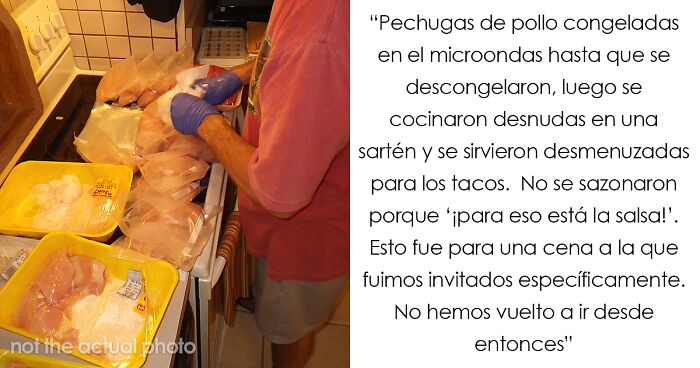 Pechugas de pollo congeladas en el microondas hasta que se descongelaron, luego se cocinaron desnudas en una sartén y se sirvieron desmenuzadas para los tacos. Además, no se sazonaron porque "¡para eso está la salsa!". Esto fue para una cena a la que fuimos invitados específicamente. Desde entonces no hemos vuelto a ir.