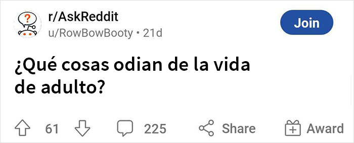 El redditor u/RowBowBooty fue muy honesto sobre la inspiración detrás de la pregunta en r/AskReddit. “Hice la pregunta porque cuanto más mayor me hago, más me doy cuenta de que la adultez no es lo que pensé que sería. Claro que como adulto tienes que trabajar duro, pero de niño también fui muy trabajador. Para lo que no estaba preparado era para el gran peso de la responsabilidad sobre uno mismo y la familia”, le dijo a Bored Panda.