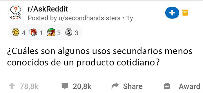 Pero todos estos productos pueden usarse con distintas intenciones. Una persona cuyo apodo es secondhandsisters probablemente tuvo ese pensamiento y acudió a Reddit para preguntar a la gente "¿Cuáles son algunos usos secundarios menos conocidos de un producto cotidiano?" Y eso creó un gran y muy útil hilo con gente compartiendo muchísimos productos que no tienen por qué usarse sólo para lo que fueron pensados inicialmente.