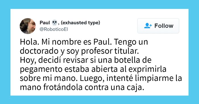 El Dr. Paul Bones, profesor asistente de Sociología en la Universidad de la Mujer de Texas, comenzó un hilo singular, divertido y completamente honesto sobre un error reciente que cometió. Este error involucró una mano, algo de pegamento y una caja. Inspirados por el doctor (¡quien también es profesor titular!), otros individuos muy educados, que son verdaderos expertos en sus respectivos campos, se sinceraron sobre sus propios errores graciosos.
