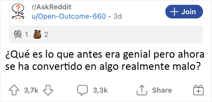 El usuario de Redditor Open-Outcome-660 se dirigió a r/AskReddit con una pregunta intrigante, en la que pedía a los demás que compartieran las cosas que creen que solían ser geniales pero que se han vuelto increíblemente malas con el paso del tiempo. La pregunta enganchó al instante a los internautas y el hilo obtuvo más de 3,4k respuestas.