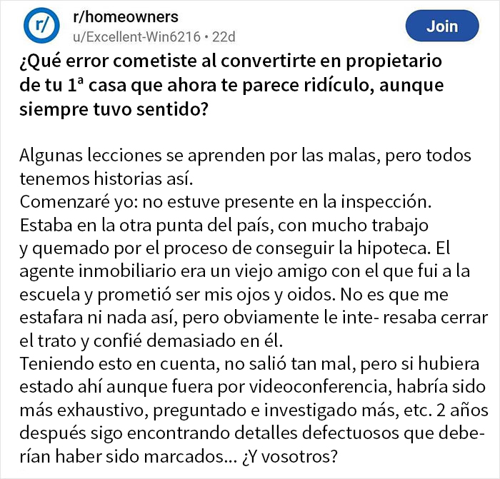 Sin embargo, como casi todo en la vida, la práctica hace la perfección a la hora de comprar una casa, por lo que es inevitable que cometamos algunos errores la primera vez. Para evitar que los futuros compradores de viviendas tengan que lidiar con los mismos problemas, los propietarios de viviendas en Reddit han estado compartiendo recientemente todas las cosas que desearían haber hecho de manera diferente al comprar sus primeras viviendas. ¡Disfruta leyendo y asegúrate de votar las ideas que tendrás en cuenta la próxima vez que te mudes!