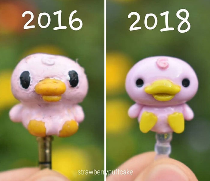 Zozo es la artista tras el Instagram Strawberrypuffcake, y hace poco decidió recrear sus antiguas obras de arcilla polimérica para ver los progresos que ha hecho. Esta talentosa artista guardó muchas de sus primeras y creaciones y ahora las coloca junto a las nuevas, y se puede ver la diferencia claramente.