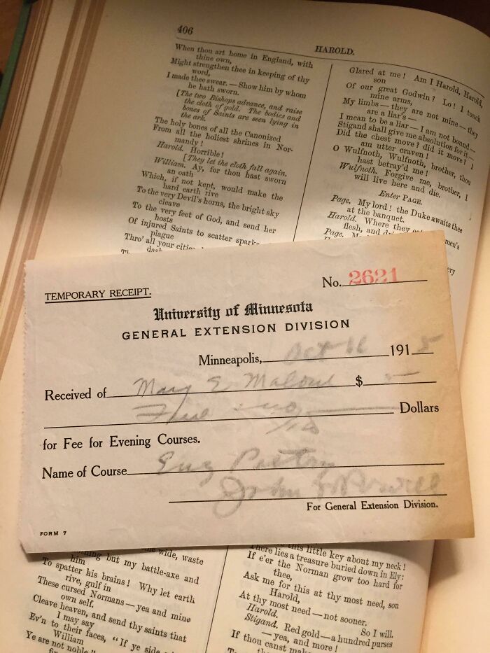 Compré un viejo libro de poesía en un mercado de pulgas y encontré este viejo recibo de una clase de poesía en la universidad. Este recibo ha estado en este libro durante 102 años.