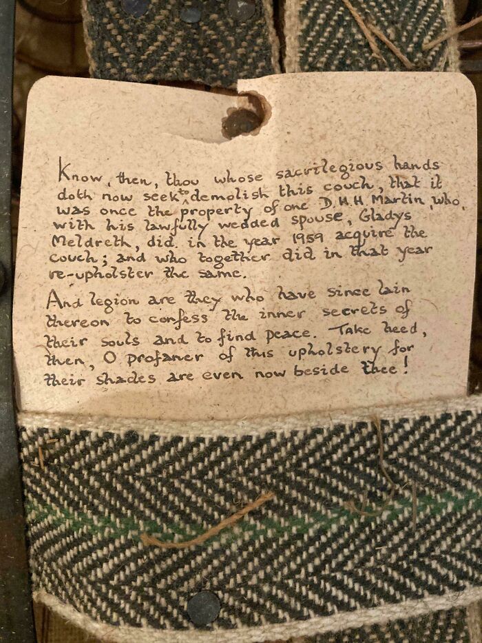 Sepan entonces, aquellos cuyas sacrílegas manos ahora buscan demoler este sofá, que alguna vez éste fue propiedad de D.H.H Martin, quien con su legalmente casada esposa, Gladys Meldreth, adquirieron el sofá el año 1959; y quienes juntos en ese año lo retapizaron.