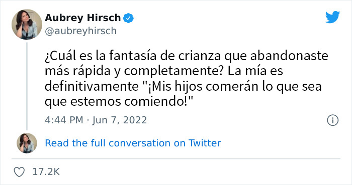 Pues bien, la escritora e ilustradora Aubrey Hirsch se siente identificada. Hace unos días, acudió a Twitter para preguntar a otras madres y padres sobre las fantasías de crianza a las que habían renunciado "rápida y completamente" después de tener hijos. Ella comenzó el hilo revelando su propio sueño que rápidamente se hizo añicos: "¡Mis hijos comerán lo que sea que estemos comiendo!".
