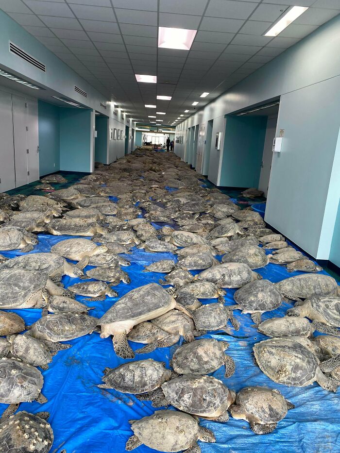 Estamos agradecidos por el apoyo de la comunidad (cercana y lejana), el liderazgo de la Ciudad de South Padre Island, y el Centro de Convenciones de la Ciudad de South Padre Island por responder a nuestras necesidades emergentes. El recuento de esta noche es de más de 1.700 tortugas marinas frías y aturdidas que se alojan en las instalaciones y el Centro de Convenciones de la Ciudad de South Padre Island. Pedimos al público que compre nuestra lista de deseos de amazon y que done a nuestra causa. Tres tortugas marinas residentes ya han sido sacadas de los tanques esta noche y están dentro del centro de educación. Tendremos que trasladar a las otras dos residentes pronto si no se restablece la electricidad. El personal, los voluntarios y la comunidad están trabajando incansablemente para proporcionar cuidados críticos a estas magníficas criaturas.