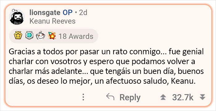 Ahora, hace tres días, el actor sorprendió a sus Fan al aparecer en la comunidad Movies de Reddit con el apodo de Lionsgate. “Hi, I’m Keanu Reeves, AMA,” (Hola, soy Keanu Reeves, Pregúntame lo que quieras), decía lacónicamente el post, causando una locura inmediata.