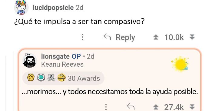 Para saber más sobre el perdurable atractivo de Keanu, así como sobre lo que su aparición sorpresa en Reddit con la sesión Ask Me Anything significó para todos los fans online, Bored Panda se puso en contacto con Sno0pyBo0, el moderador del subreddit Keanu Being Awesome (Keanu siendo genial) que, al igual que otros 353.000 miembros de esta bulliciosa comunidad online, es un fan de Keanu y de sus películas desde hace mucho tiempo.