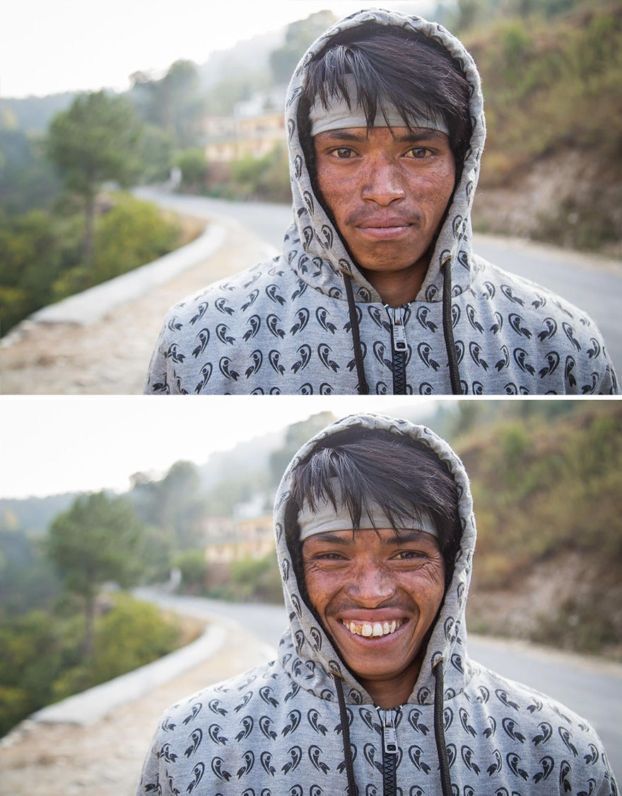 Durante los siguientes años, en mis aventuras fotográficas (sobre todo en las calles de la India) le pedía a personas al azar que posaran sin sonreír y sonriendo. Esas imágenes son el corazón de mi proyecto. Quiero recrear el punto de vista desde el que vemos a un desconocido y como cambia lo que asumimos tras verlo sonreír.