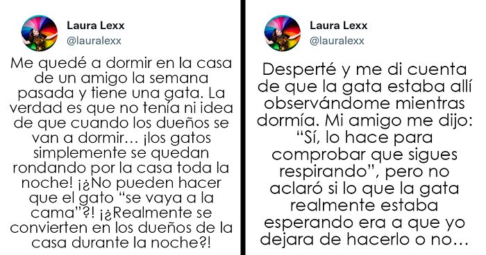 En resumen, la autora reveló que cuando se quedó a dormir en la casa de su amigo, quien es dueño de una gata, se enteró de cosas muy interesantes sobre estas criaturitas peludas. Al ser dueña de un cachorro, Laura Lexx no podía creer que los gatos prácticamente no durmieran por las noches. Además, mencionó que en un momento de la noche, se dio cuenta de que la gata se dedicó a pasar su tiempo libre observándola mientras dormía y, al mencionárselo a su amigo, este le respondió: “Lo hace para comprobar si estás respirando o no”, llevando a que la autora se preguntara si en realidad la minina planificaba un homicidio.