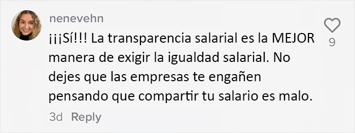 "Aunque mucha gente se siente avergonzada o tímida sobre su salario, tenemos que darnos cuenta de que nuestros salarios no dicen nada sobre nuestro valor, nuestra inteligencia o lo que somos como seres humanos, y hablar de ello ayuda a mucha gente, combate la brecha salarial de género, mejora la diversidad y minimiza las oportunidades de discriminación en las organizaciones".