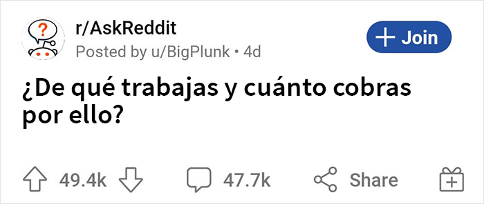 Este tipo de diálogo podría ayudarnos a ver un horizonte repleto de perspectivas y oportunidades más que prometedoras pero, al mismo tiempo, suena como algo casi imposible. Hemos llegado a un punto donde se considera inapropiado y hasta de mala educación hablar sobre tus ingresos. En un intento de cambiar esta situación, el redditor u/BigPlunk utilizó la plataforma para preguntarle a los usuarios: “¿De qué trabajas y cuánto cobras por ello?”.