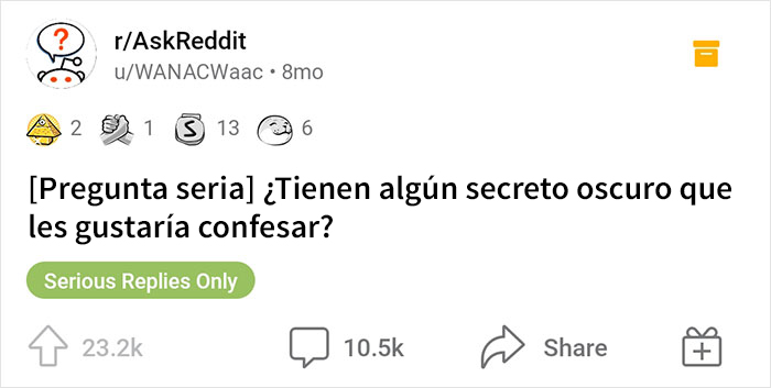 Además del hilo que les hemos traído aquí, otra publicación que se volvió muy popular en su momento fue una creada en “Pregúntale a Reddit”, la comunidad de habla hispana que funciona de manera similar a “Ask Reddit”. Allí, un internauta preguntó: “¿Cuál es el secreto que no le has confesado a nadie hasta ahora?”. Entre las respuestas, había varias confesiones graciosas, pero también se hallaban algunas otras más graves: “Falsifiqué documentos importantes”, confesó una usuaria. “He matado a tres hombres, uno de ellos fue en defensa propia y los otros dos fue de manera accidental”, comentó otro internauta.
