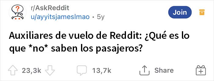 De acuerdo, no tengo ni idea de cómo es ser auxiliar de vuelo, así que tengo mucha curiosidad por el misterioso mundo de la industria aérea. Por suerte, el usuario de Reddit Ayyitsjameslmao se puso en contacto con los auxiliares de vuelo preguntando: "¿Qué es lo que no saben los pasajeros?". Así que hoy podemos conocer algunos jugosos secretos de los iniciados. Hemos reunido algunas de las respuestas más interesantes y reveladoras de los auxiliares de vuelo para compartirlas con todos vosotros, así como una entrevista con B, presentador de The Flight Attendant Podcast, para que la próxima vez que hagan un viaje sepan exactamente cómo obtener el mejor servicio. Que disfruten de esta lista de información del sector y no dejen de darle un voto positivo a sus respuestas favoritas. Y si quieren aprender aún más de los auxiliares de vuelo, consulten el último artículo de Bored Panda sobre el mismo tema aquí.