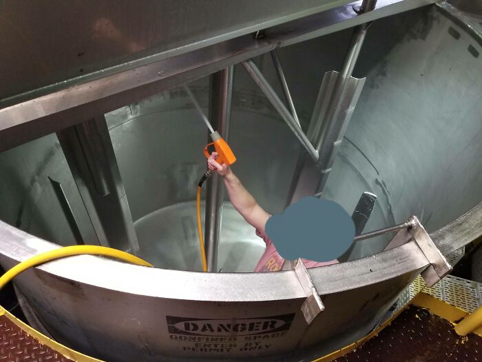 Nuevo trabajo. El tipo que me enseña lo que hay que hacer se trepa a un mezclador de 2500 galones para limpiarlo