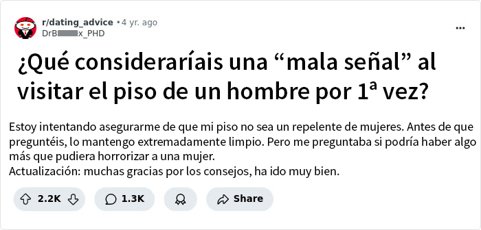 Alguien preguntó a las mujeres «¿Qué considerarías una “mala señal” cuando vas al piso de un hombre por primera vez?» y la gente compartió sus pensamientos. Así que empieza a leer, y si eres un hombre, quizás puedas tomar algunas notas. Vota por tus favoritos y añade tus propias ideas y experiencias en los comentarios de abajo.