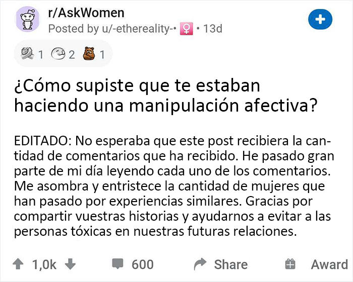 Para saber cómo detectarlo, la usuaria de Reddit -ethereality- hizo un post en la página r/AskWomen de la plataforma, diciendo: "¿Cómo supiste que te estaban haciendo una manipulación afectiva?". Por suerte, las mujeres respondieron.