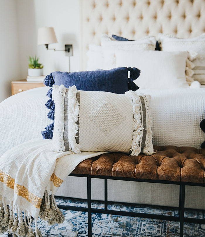 Millones de almohadas y cojines sobre una cama. Hace que la habitación parezca instantáneamente desordenada cuando tienes que moverlos y apilarlos en el suelo para poder entrar.